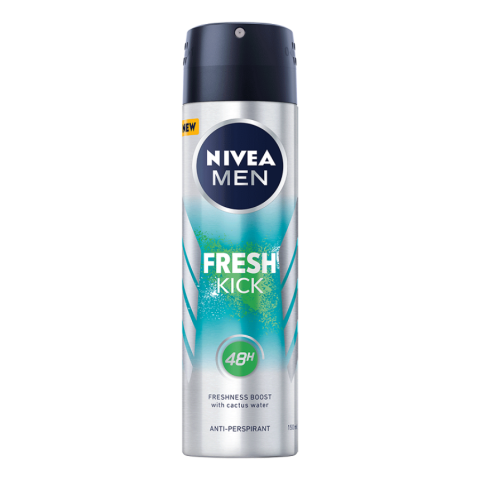 NIVEA MEN Fresh Kick izzadásgátló deo spray véd az izzadság ellen akár 48 órán keresztül. Pezsdítően üde, férfias illata és kaktuszvizet tartalmazó formulája ápolja a bőrt és azonnali frissességet biztosít.