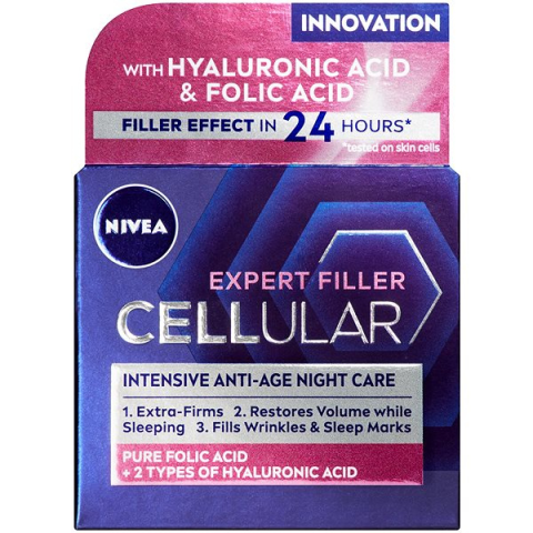 Arckrém - zsíros, normál, kombinált, száraz és érett bőrre ajánlott, 15 SPF védőfaktor, 40+ korosztály számára A NIVEA Hyaluron Cellular Filler Anti-Age SPF15 alkalmas a 40 év feletti nők érett bőrének minden típusára. A bőr regenerálódik, megerősödik, puha és láthatóan megfiatalodik. Hialuronsavat és folsavat