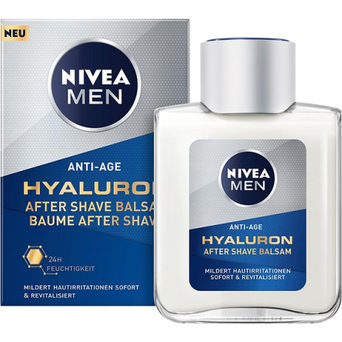 Borotválkozás utáni balzsam - hidratáló, nyugtató, regeneráló és revitalizáló hatás, megfelelő normál száraz bőrre, űrtartalma 100 ml A NIVEA Men Hyaluron After shave balm borotválkozás utáni balzsam hialuronsavat tartalmaz. A balzsam megszabadítja a bőrt az öregedés első jeleitől, borotválkozás után nyugtatja a bőrt, regenerálja és
