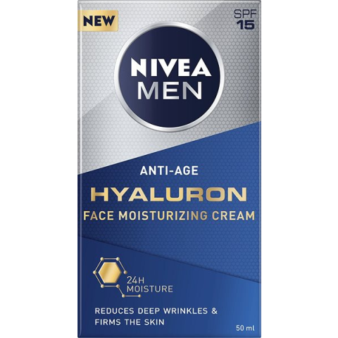 Arckrém - zsíros, normál, kombinált, száraz és érett bőrre ajánlott, 45+ korosztály számára A NIVEA MEN Hyaluron Moisturizer ránctalanító, hidratáló krém férfiaknak tiszta hialuronsavat és pro-retinolt tartalmaz. Ezek az összetevők aktiválják a hámsejteket, így csökkentik a már megjelent rán