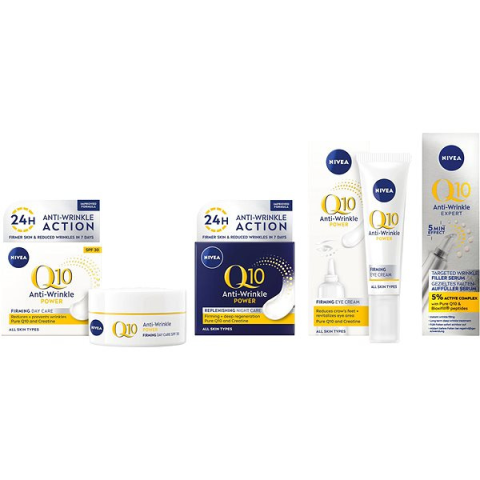 Kozmetikai szett - tartalma: szemránckrém, arckrém, arcszérum A NIVEA Q10 Power Anti-Wrinkle Filler Set kozmetikai készlet arckrémet, szemkrémet, éjszakai krémet és arcszérumot tartalmaz. A termékcsalád készítményei minden 30 év feletti nő számára készültek. A r