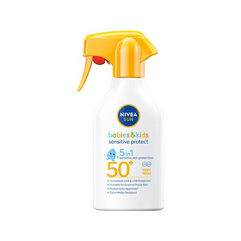 Napozó spray - 50 védőfaktoros, gyerekek részére, érzékeny, zsíros, normál, kombinált, száraz és érett bőrtípusra ajánlott, testre, 270 ml-es NIVEA termékek a gyermekek bőrének ápolására a nyári hónapokra. A NIVEA SUN Kids Spray SPF 50+ védőfaktorral védi a bőrt. A NIVEA Sun Kids Ultra Sensitive Trigger Spray SPF 50+ könnyen kenhető