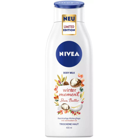 A NIVEA Winter Moment Testápoló Tej kifejezetten a hideg téli hónapokra lett kifejlesztve, hogy intenzív ápolást és hosszan tartó hidratálást biztosítson a száraz bőr számára. Gazdag formulája shea vajjal és értékes olajokkal gazdagított, amelyek mélyen t