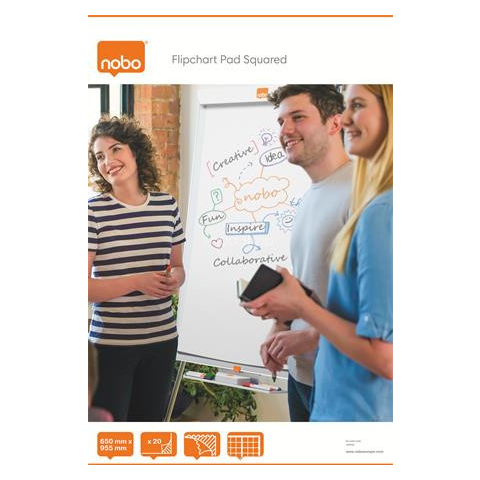 Flipchart papír, kockás, 650X955mm, 20 lap, NOBO Kiváló minőségű flipchart papír tömb információk, ötletek feljegyzéséhez, megbeszéléseken történő használathoz. könnyen lapozható és szükség esetén könnyen letéphető, perforált lapok 60 g-os, erős TMP p