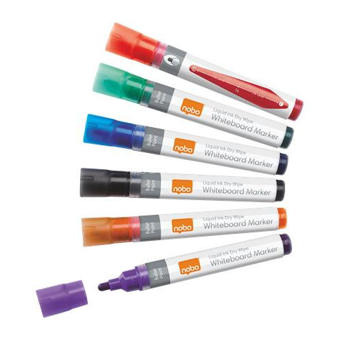 Táblamarker készlet, 1-3 mm, folyékonytintás, NOBO, 6 különböző szín A 3-az-1-ben tollakkal szárazon törölhető táblára, flipchart tömbökre és írásvetítő fóliákra is lehet írni Az átlátszó tollszár pontosan mutatja, hogy mennyi tinta maradt A feltűnő, f