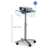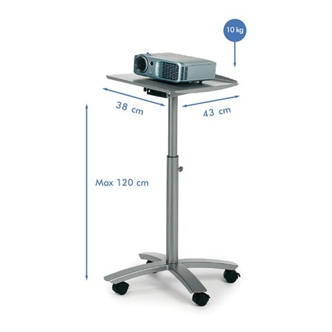 - - ideális projektoros vagy diavetítős előadásokhoz - előadói pultnak is használható - dönthető és forgatható - munkalap magassága 81 cm és 120 cm között állítható - fékezhető kerekek - teherbírás: 10 kg - tömeg: 8 kg - szín: ezüst-metál - az elek