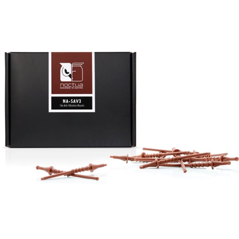 Ventilátor rezgéscsillapító - a készlet 16 rezgésgátló csavart tartalmaz akár 4 db 10-25 mm vastagságú ventilátor felszereléséhez, 5 előre meghatározott reteszt, anyaga szilikon A Noctua NA-SAV3 egy ventilátor készlet, amely 16 különálló rezgéscsillapító csavarból áll 4 ventilátor rögzítésére. A szett jóval kényelmesebb telepítést kínál, mint a hagyományos ventilát