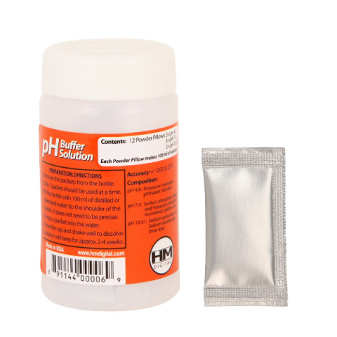 A HM pH-pufferoldata por formájában (zsákban) kerül forgalomba, ezért kevés helyet foglal el, és kicsi. A pH-pufferoldatot egyszerűen összekeverjük a mellékelt 100 ml-es tartályban (1 tasak 100 ml desztillált vízben) A megfelelő tárolás mellett a pH-mérő