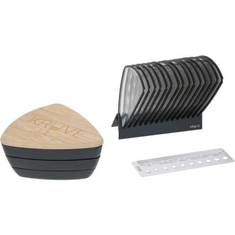 A Kruve Sifter egy professzionális szűrő, amely | alumínium testből, fa fedélből és 15 | szűrőből áll az őrölt kávéhoz: 200,300,400,500, | 600,700,800,900,1000,1100,1200,1300,1400, | 1500,1600 µm és egy szűrőtartó. | Tartalmaz egy metrikus vonalzót 16 cm-