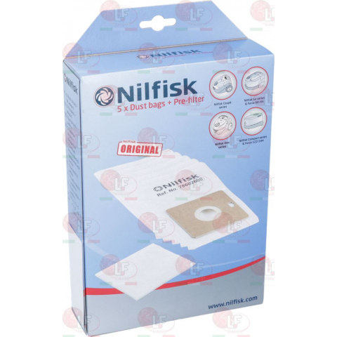 Eredeti Nilfisk porzsák és előszűrő készlet, amely biztosítja porszívód maximális szívóerejét és a tiszta levegőt. A csomag 5 db szintetikus porzsákot és 1 db motort védő előszűrőt tartalmaz.