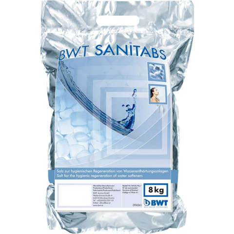 A BWT SANITABS egy speciális, 2 az 1-ben regeneráló sótabletta, amely szabadalmaztatott tisztító komponenst tartalmaz. Biztosítja a vízlágyító berendezés maximális higiéniáját, eltávolítja a lerakódásokat és meghosszabbítja a készülék élettartamát.