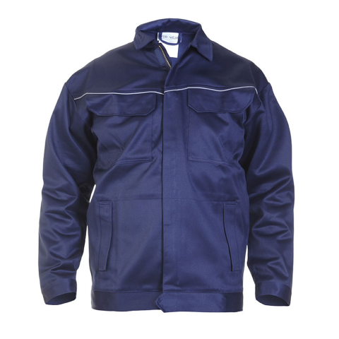 rejtett cipzár, tépőzárral2 mellzseb2 oldalzsebtépőzárral állítható mandzsettaextra fényvisszaverő csíkok350 gramm99% pamut + 1% antisztatikus szál
