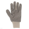 Vászonkesztyű, tenyerén csúszásgátló PVC-pöttyözéssel. Gumírozott mandzsetta. Az EU-szabványnak megfelel. 12 pár/csomag. 9-es méret, férfi L-es .