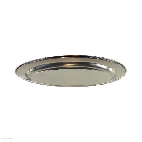 Rozsdamentes acélból készült tálca, ovális alak, külső mérete kb. 30 x 22 cm, emelt szélű. Mosogatógépben nem mosható! .