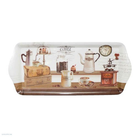 Kávé témájú, jól tisztítható műanyag tálca. Szögletes design, lekerekített sarkak. Otthoni és irodai használatra egyaránt alkalmas. 33 x 14,5 cm .