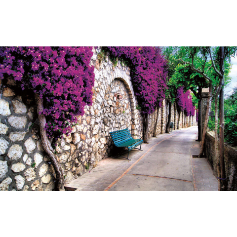 Fotótapéta - Lilla virágok a kőfal mellett - 4 részes Varázsolja otthonát egy mediterrán hangulatú oázissá ezzel a gyönyörű fotótapetával! A 4 részből álló tapéta egy hangulatos sikátort ábrázol, lila bugainvillea virágokkal díszített kőfalakkal és e...