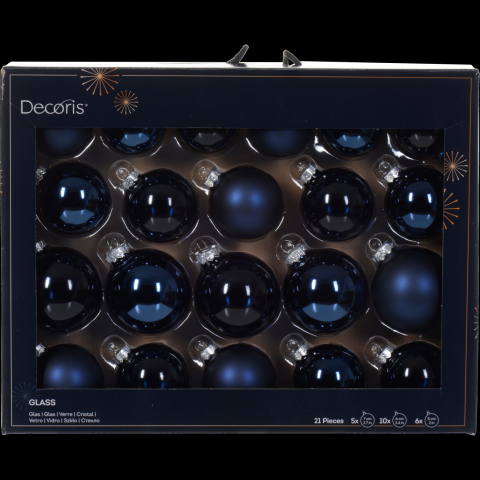 Karácsonyfadísz gömb szett üveg 21 db-os több méret éjkék