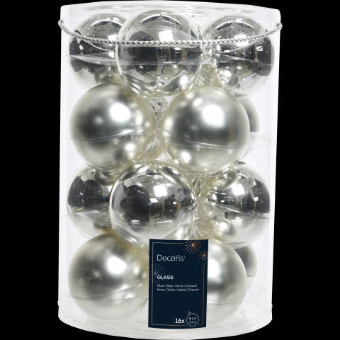Karácsonyfadísz gömb szett üveg 16 db-os ezüst, 8 cm-es díszek