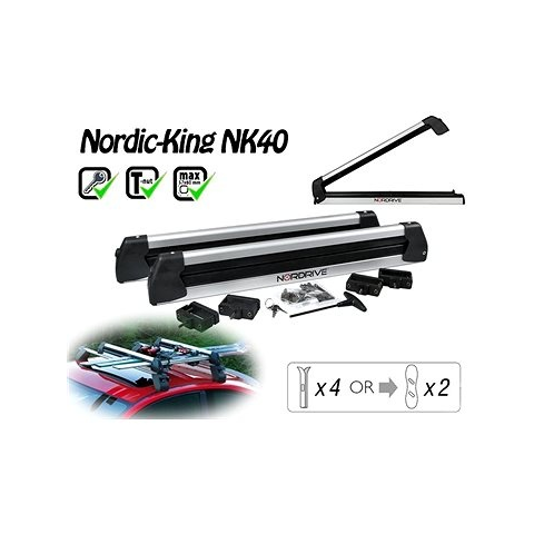 Síléctartó - 4 pár síléc szállításához, csukható, tetőcsomagtartóra szerelhető, alumínium Az elegáns Nordrive Nordic King Evo 4 alumínium tetőre szerelhető síléctartó nagyszerű segítő négy síléc vagy két snowboard szállítására. A tartó előnye a Thule kompatibilitása és a kulccsal való lezá