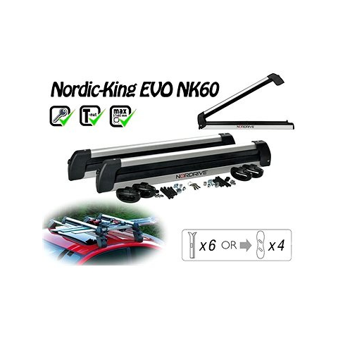 Síléctartó - 6 pár síléc szállításához, csukható, tetőcsomagtartóra szerelhető, alumínium Az elegáns Nordrive Nordic King Evo alumínium tetőre szerelhető síléctartó nagyszerű segítő hat síléc vagy négy snowboard szállítására. A tartó előnye a Thule kompatibilitása és a kulccsal való lezárá