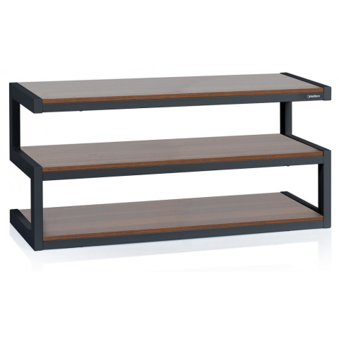 Professzionális TV állvány a Norstone-tól! Nagy stabilitású készüléktartó állvány, Méretek (szé x ma x mé): 1100 x 530 x 400 mm, Polcok terhelhetősége (kg): 30 (felső) / 50 / 50 , Polcok közötti távolság: 190/199 mm, Csiszolt fém szerkezet, dió színű MDF