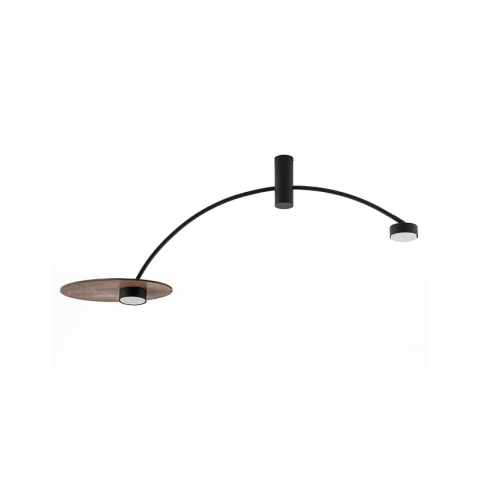 Moden mennyezeti lámpa, kör alakú fa díszítéssel. A lámpa váza, valamint a dönthető lámpafejek feketére festett fémből készültek. Mennyezeti rózsája 15 cm magas, átmérője 5,5 cm. LED fényforrással működtethető, melyet a csomagolás nem tartalmaz...