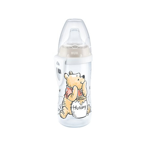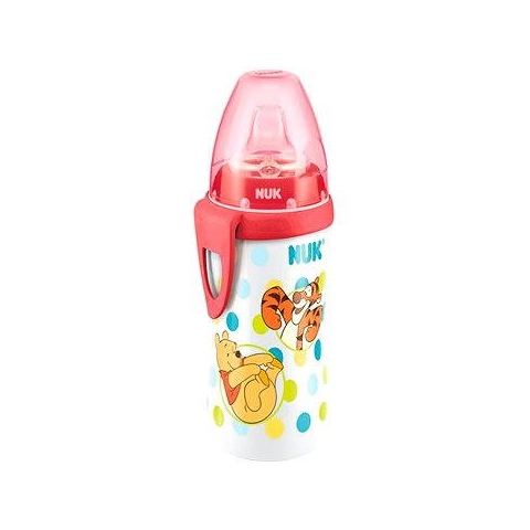 Gyerek kulacs - anyaga műanyag és szilikon, ivócsőrrel, szigetelt kupak, ajánlott 12 hónapos kortól, űrtartalma 300 ml, ergonomikus kialakítás, csöpögésmentes, átlátszó kivitel többszínű dizájn A NUK Activ Cup cumisüveg fehér-piros színben, 300 ml-es űrtartalommal és vidám Micimackós motívummal rendelkezik, és az önálló ivás gyakorlásához alkalmas. Az üveg rendkívül könnyű, ellenálló és törh