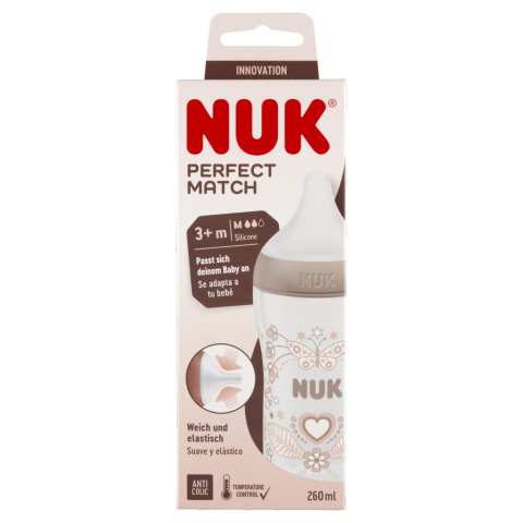 NUK Perfect Match cumisüveg, puha szilikon szívófejjel, BPA mentes 0 hónapos kortól, Anti Colic , hőmérséklet szabályozóval. A nagy, puha ajakpárnának köszönhetően a baba etetés közben nem érintkezik kemény műanyaggal, hanem mindenhol bőrszerű érzést
