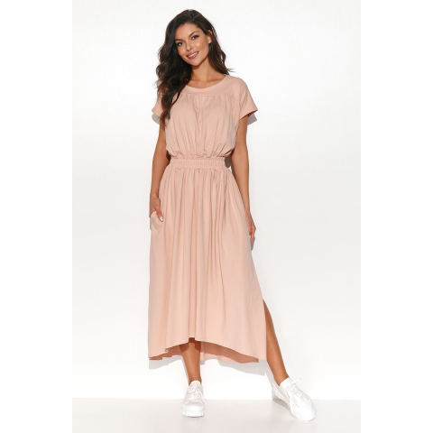Hétköznapi Ruha Model 176160 Numinou MM-176160. Színe: RózsaszínHosszú, aszimmetrikus ruha kötött tréningruha anyagból varrva. Kerek nyakkivágással és a derekán húzózsinórral ellátott gumival. A ruha hátsó része kissé hosszabb, mint az eleje, aminek köszönhetően az alkalmi kreáció érdekesen mutat a sziluetten. A ruha szinte teljes hosszában finom drapéria található. Oldalt oldalsó csúszózsebeket találunk. A kerek nyakkiv