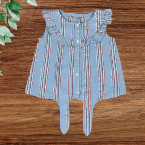 Ezüst szálas ujjatlan blúz Egyenes szabású, kerek nyakkivágású, eleje gombos, alja megköthető. Hibátlan állapotú.