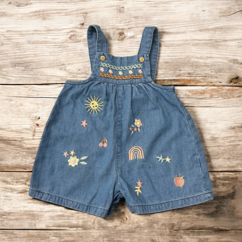 Hímzett, kantáros rövidnadrág Bőszabású, hátulja gumírozott, vállpántja gombos, ülepnél patentos. Kellemes puha farmer anyag (pamut) Hibátlan állapotú.