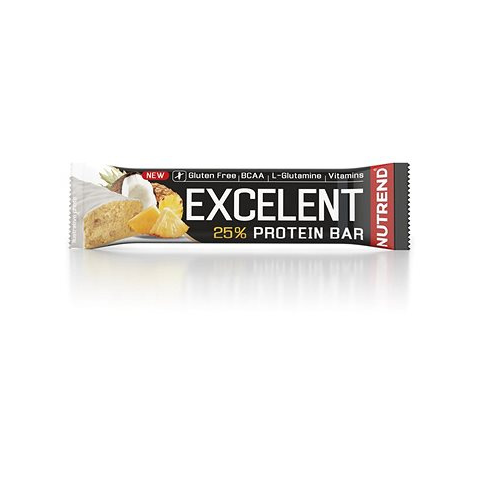 Protein szelet - 24,6 g fehérjetartalom 100 g termékben, 441 kcal energiaérték 100 g termékben, ananász és kókusz ízesítéssel, tömege 85 g A Nutrend Excelent egy 85 g-os ananász és kókusz ízű fehérjeszelet, amely magas fehérje- és rosttartalmat kínál. Fehérjetartalma 20,4 g, szénhidráttartalma 36,2 g szeletenként. L-leucin, L-izoleu