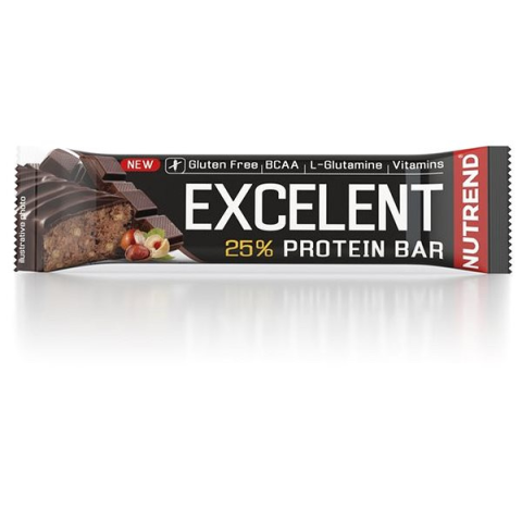 Protein szelet - 24,8 g fehérjetartalom (100 g termékben), a gyártó által 100 g-ra megadott energiaérték 441,92 kcal, tömege 85 g, csokoládé ízesítéssel A Nutrend Excelent egy 85 g-os csokoládé ízű fehérjeszelet magvakkal, amely magas fehérje- és rosttartalmat kínál. Fehérjetartalma 20,4 g, szénhidráttartalma 36,2 g szeletenként. L-leucin, L-izol