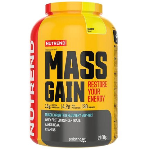 Testtömegnövelő - 339 kcal energiatartalom/100 g, Nutrend Mass Gain Gainerbanán, 2100 gA Nutrend Mass Gain szénhidrát-fehérje koncentrátum ideális eszköz a tömegnövelő fázisban és az izomtömeg építésében. Több mint 20%-os, kiváló minőségű fehérjetart