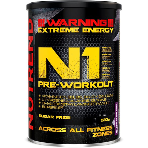 Teljesítményfokozó - serkentő, fekete ribizli ízű, 510 g, por formában A fekete ribizli ízű Nutrend N1 egy ún. pre-workout - az emberi szervezet megterhelés előtti stimulálására, az izmok felpumpálására és a fizikai teljesítmény növelésére szolgáló leghatékonyabb anyagok