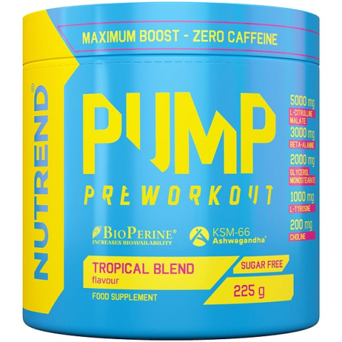 Teljesítményfokozó - (kicker), por alakban, vegyes trópusi ízesítéssel Nutrend PUMPTropical blend, 225 gA Nutrend PUMP anabolizer erő- és állóképességi sportolók számára készült. Edzés előtt kell fogyasztani, finom ízét pedig biztosan élvezni fogod. A csomag 15 adag elké