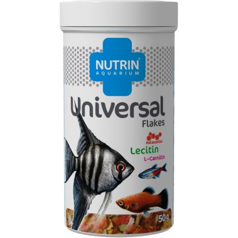 Universal Flakes Teljes értékű táp minden akváriumi halfajta számára. Adagolási útmutató: Naponta többször szórjon olyan mennyiségű tápot a vízbe, amelyet a halak néhány perc alatt képesek elfogyasztani. Hűvös, száraz, sötét helyen tárolja.