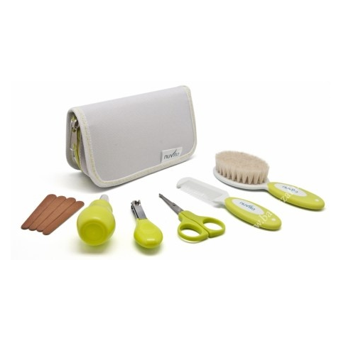 A szettben 6 darab babaápolási eszköz található természetes szőrből készült kefe, fésű a baba első pár hónapjára lekerekített élű olló és körömcsipesz nikkelmentes rozsdamentes acélból, körömreszelők Az extra puha szilikonból készült orrsz