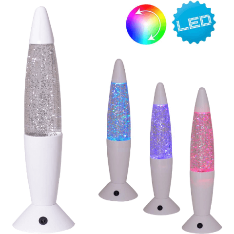 Lávalámpa "Glitter, Tornado", 6db színes LED, 60Lm, 36×10cm, automatikus színváltás, csillámporral, tartozék: 3db AA elem.