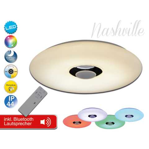 LED Bluetooth mennyezeti lámpa "Nashville", LED 24W, 1020lm állítható színhőmérséklet, 2700-6000K, Bluetooth által vezérelhető hangszóró 6W, állítható RGB színek távirányítóval, műanyag/króm, átmérő:40cm, éjjeli funkció, IP44, Beépített LED fényforrással értékesítjük, a fényforrás nem cserélehtő a lámpatestben, energiaoasztály: A.