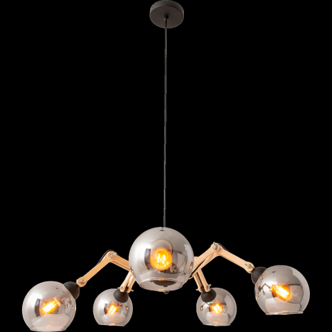 A sOITO ötágu függeszték karjai trópusi kaucsukfából készültek ez a fa típus a minőségi lakberendezési termékek kedvelt alapanyaga. A Soito függőlámpa 130 cm összmagasságával és 80 cm átmérőjével különösen alkalmas nappalik és hálószobák megvilágítására Az füstszínű búrák átmérője egyenként 11 cm.