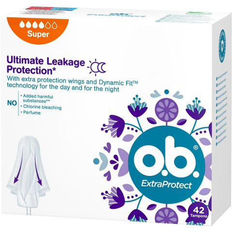 Tampon - innovatív DynamicFit technológiával, klórmentes, szuper méret, 42 db a csomagban Szeretnél azokon a napokon is normálisan sportolni és a megszokott dolgokat csinálni? Akkor a szuper O. B. Extra Protect Super 42 db tamponra van szükséged. Száz százalékos kényelmet és biztonságot ga