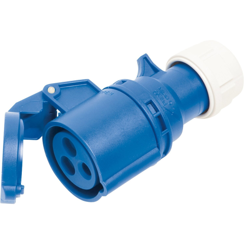 A kék színű, 3-pólusú CEE Caravan lengőaljzat szabványos elektromos csatlakozásokhoz használható. A csatlakozó csavar nélküli csatlakozással rendelkezik. Ezenkívül biztonsági rugós mechanizmussal ellátott védősapkával rendelkezik, amely megvédi a ráfröccsenő víz és az idegen testek ellen. A csatlakozó megfelel az IP44 érintésvédelmi osztálynak, ezért kültéri használatra is alkalmas. Sokoldalúan használható, különösen kertekben, kempingekben és műhelye