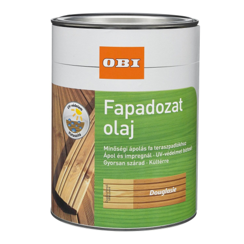 Az OBI teraszpadló-ápoló olaj mélyen behatol a faanyagba, kiemeli a természetes erezetet, valamint az időjárási hatásokkal és a káros UV-sugarakkal szemben ellenállóbbá és kevésbé érzékennyé varázsolja a padlót. Tartósító és ápoló hatású, megakadályozza a kiszáradást, a repedezést és a kifakulást, időjárásálló, növeli a vízlepergető hatást, és kiváló nedvességszabályozást tesz lehetővé. Kültéri terasz-faburkolatok első kezeléséhez és áp