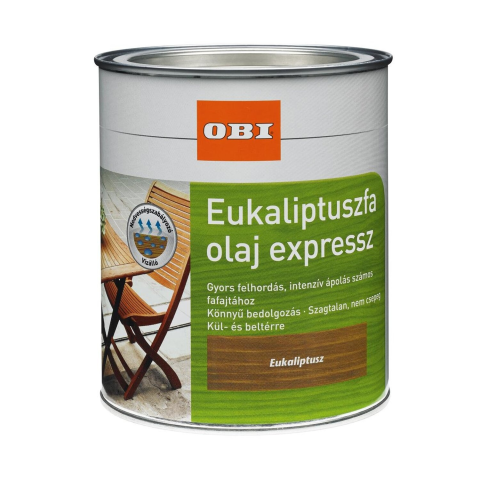 Az OBI Express faápoló olaj egy gyorsan száradó, természetes, speciális faápoló olaj. Ideális fabútorok első kezelésére és ápolására kül- és beltéren egyaránt. Bármilyen nem mérettartó fához, pl. lambériákhoz, kerítésekhez, pergolákhoz, belátásgátlókhoz és egyéb kemény- és puhafából készült szerkezeti elemekhez is alkalmas. Az OBI Express faolaj csöpögésmentes, szagtalan és könnyen felhasználható. Kiemeli a fa természetes erezetét, felfrissíti