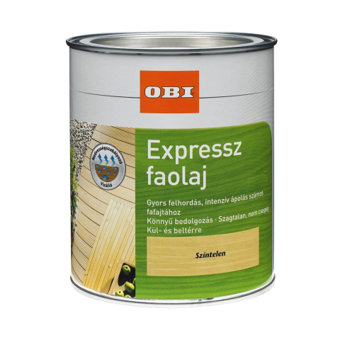 Az OBI Express faápoló olaj egy gyorsan száradó, természetes, speciális faápoló olaj. Ideális fabútorok első kezelésére és ápolására kül- és beltéren egyaránt. Bármilyen nem mérettartó fához, pl. lambériákhoz, kerítésekhez, pergolákhoz, belátásgátlókhoz és egyéb kemény- és puhafából készült szerkezeti elemekhez is alkalmas. Az OBI Express faolaj csöpögésmentes, szagtalan és könnyen felhasználható. Kiemeli a fa természetes erezetét, felfrissíti