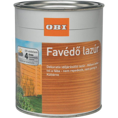 Dekoratív, oldószertartalmú, vékonyrétegű, időjárásálló lazúr számos nemesfa-színárnyalatban új és felújító festéshez, minden nem mérettartó kültéri fa szerkezeti elem (pl. belátásgátló kerítések, előtetők, tetők alsó részei, fedett gépkocsibeállók, kerítések, erkélykorlátok stb.) kezeléséhez. Az OBI favédő lazúr mélyen behatol a fába, ápolja és védi azt az időjárás káros hatásaival szemben, továbbá kihangsúlyozza a fa természetes ere