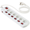 A fehér műanyagból készült, hatszoros OBI asztali elosztó 7 kapcsolójával lehetővé teszi, hogy ideálisan szabályozza áramfogyasztását. A 6 csatlakozó elem mindegyike működtethető a többitől függetlenül, mivel a csatlakozóaljzatoknak saját ki-/bekapcsolójuk van. Maximális terhelhetősége 3680 W. Névleges feszültsége 230 V, névleges áramerőssége 16 A. Az asztali hosszabbító elosztót gyermekvédelemmel és túlterhelés elleni védelemmel látták el. 1,5 m hos