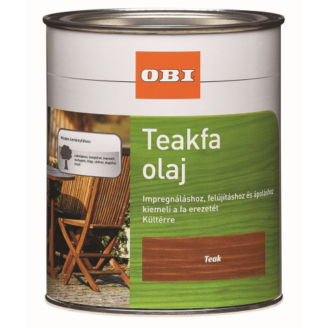 Az OBI teakfa egy oldószertartalmú, megújuló nyersanyagokon alapuló, könnyen feldolgozható természetes olaj, amely mélyen behatol a faaljzatba, impregnálja azt, növeli a vízlepergetést, felfrissíti a természetes olajtartalmat, valamint kiemeli a fa természetes színét és erezetét. Teakfa, tölgy, bangkirai, eukaliptusz, mahagóni, meranti stb. első kezelésére, felfrissítésére és ápolására kültéren, pl. kerti bútorokhoz, teraszdeszkákhoz, facsempékhez, paliszádo