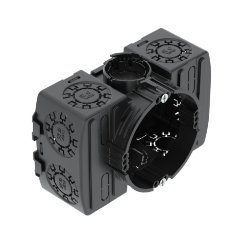 A kép illusztráció! Vakolat alatti elektronikai doboz, oldalsó kapocstérrel, szögletes alakú, a falazatba való beépítéshez legalább 50 mm mélység szükséges. • Összekötő elem bajonettzárral, amely mindkét oldalon összekapcsolható • 10 kombinált csőbevez